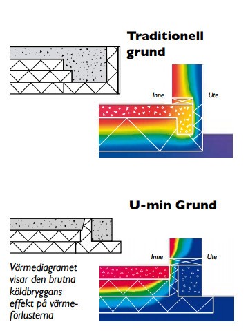 В шведской документации приведены термограммы, из которых следует, что энергоэффективность Супергрунд(Supergrud) выше, чем традиционной УШП. Так как нет нужды отапливать системой теплого пола массивные несущие ребра, расположенные близко к окружающей среде.